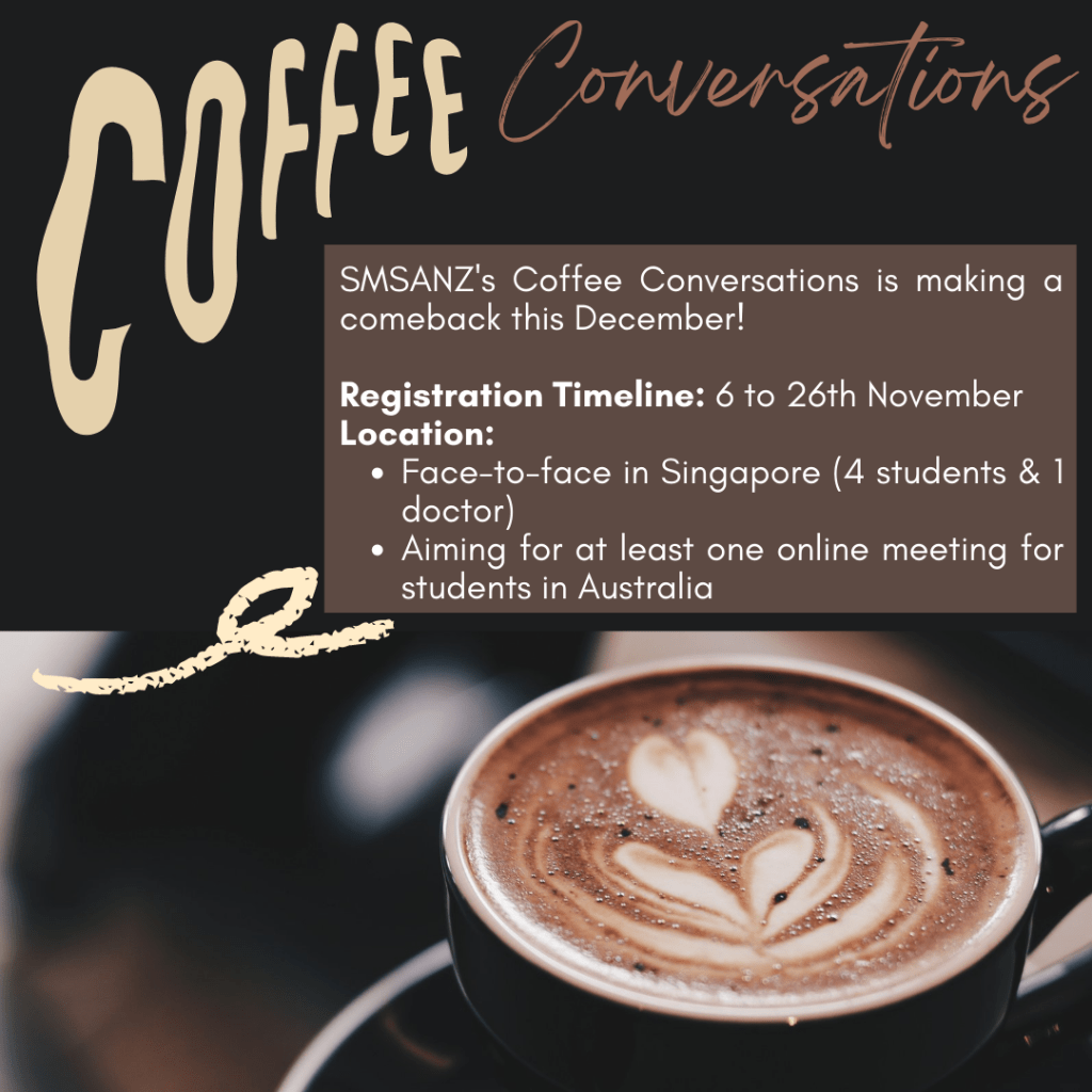 This SMSANZ Networking Series: Coffee Conversation event aims to continue giving our SMSANZ members a platform to network and learn about the Singapore healthcare system. Our members are medical students studying in Australia or New Zealand, most of which are currently stuck here in Singapore, as borders back overseas have not been open. This event mainly serves as an opportunity for these students to learn from various clinicians of different specialities, especially since there is a lack of student clinical attachments and face to face networking opportunities this year.